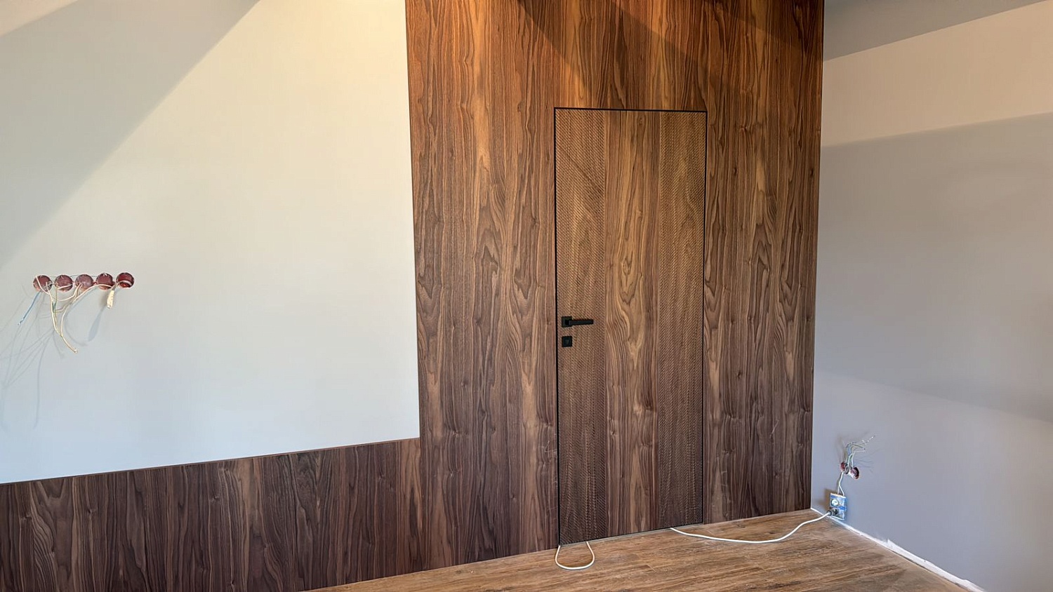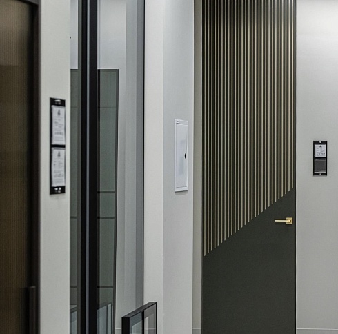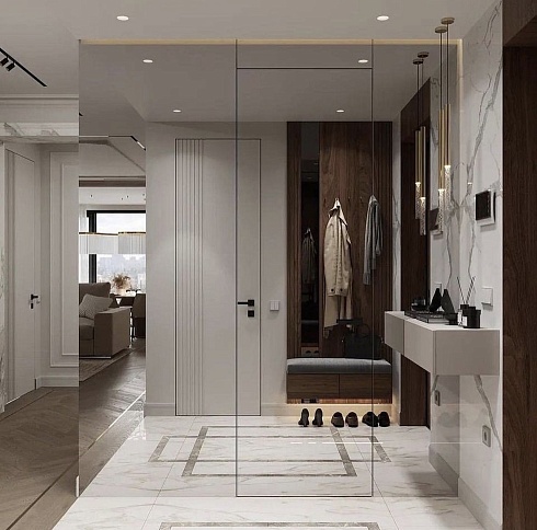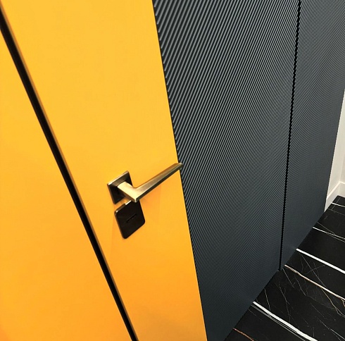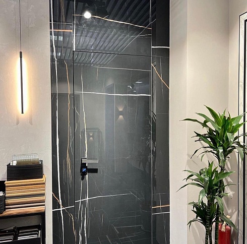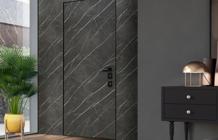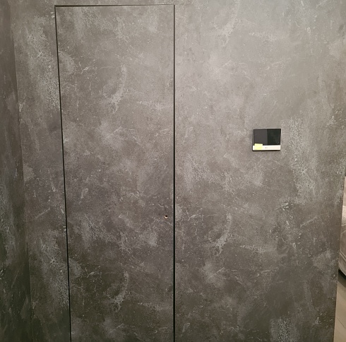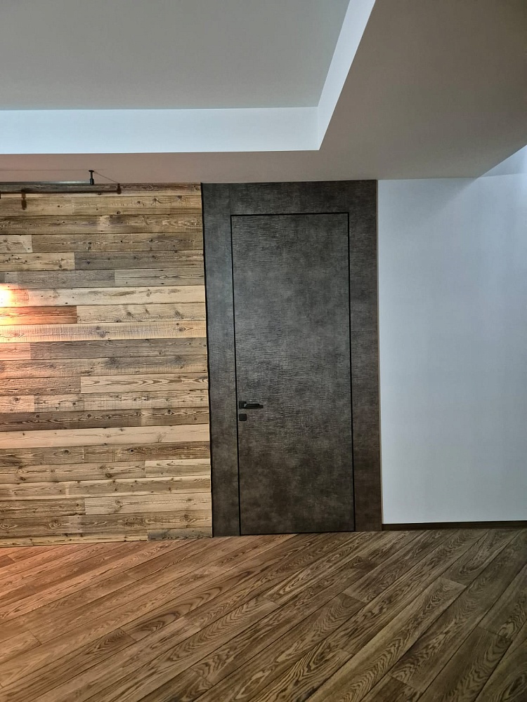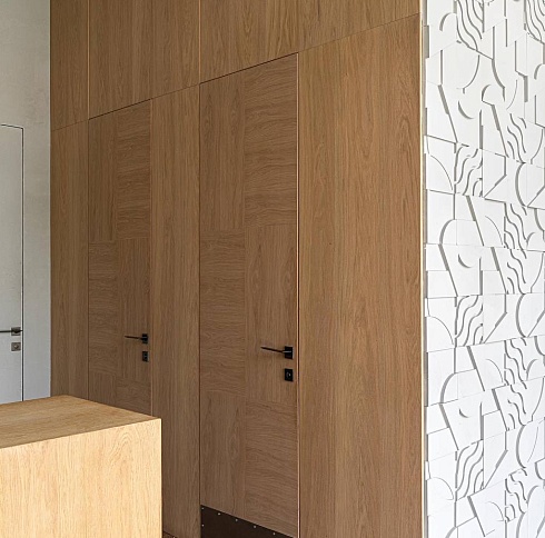 Современно и эстетично. Добавить графичности или сделать акцент именно на скрытой двери помогут современные отделки, например, шпонированные панели или оформление антивандальным материалом с имитацией природного камня. Бонус - возможность изменения облика в соответствии с новыми требованиями интерьера.