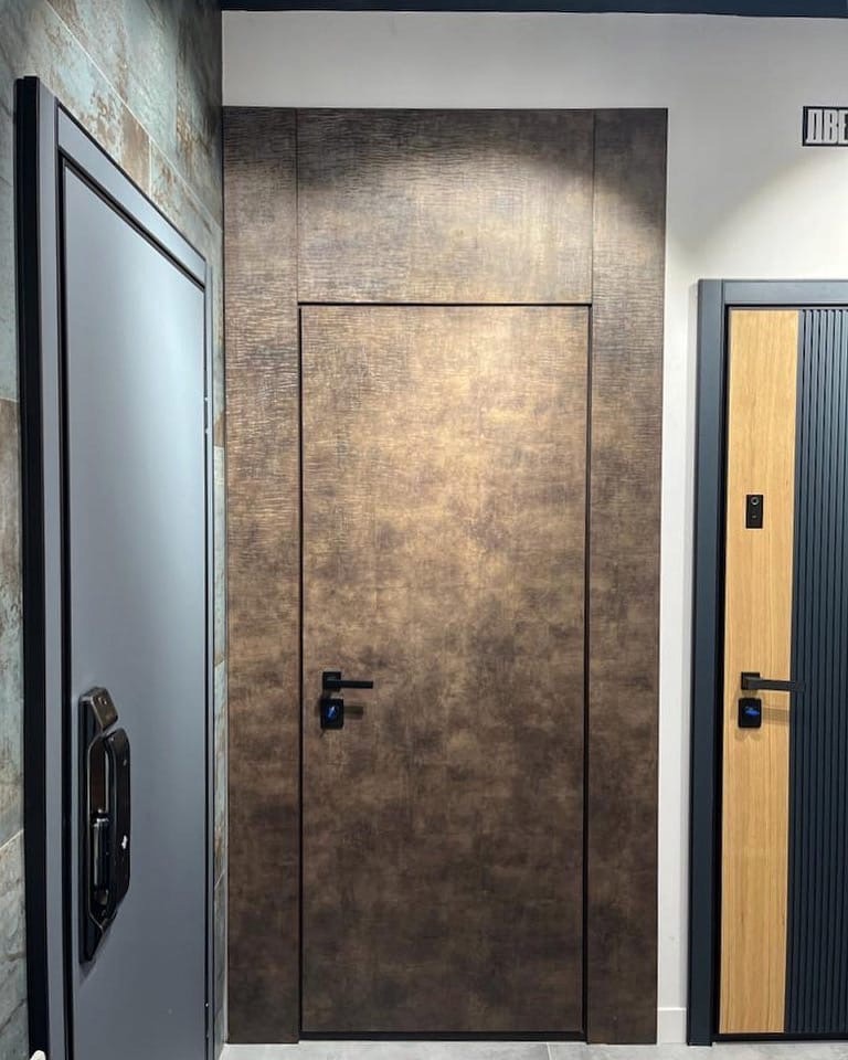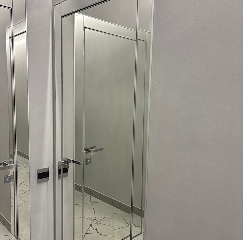 В производстве дверных полотен распространены стеклянные, пластиковые и металлические материалы. Использование зеркал и отражающих поверхностей рассеивает свет, что позволяет визуально увеличивать площадь квартиры.
