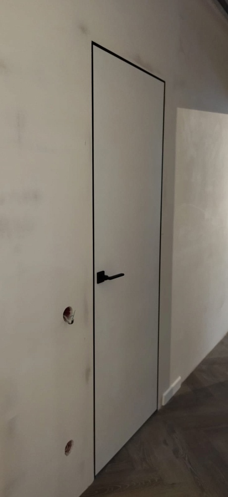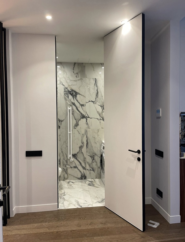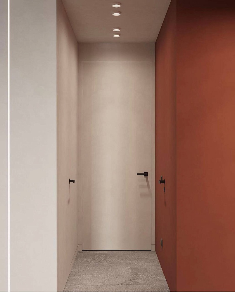 Дверь, которая растворится в дизайнерском пространстве. Универсальное решение - гладкое полотно со срытым коробом, обработанное белым грунтом.